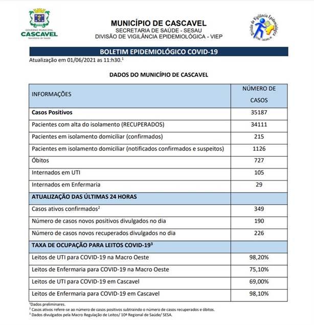 A Prefeitura de Cascavel divulgou nesta terça-feira (01), o boletim de casos de coronavírus na cidade. Cascavel tem ao todo 35.187 casos positivos, sendo que 34.111 pessoas já se recuperaram da doença. Atualmente 1.126 pessoas encontram-se em isolamento domiciliar com casos confirmados e suspeitos.