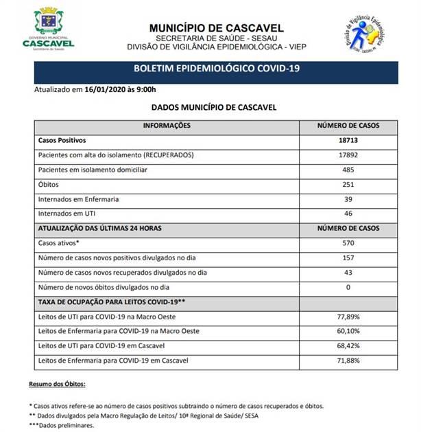 Neste sábado (16), a Secretaria de Saúde confirmou 18.716 casos de Covid-19 em Cascavel. Dos casos positivos, 17.892 pessoas estão recuperadas.
