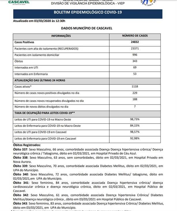 Dos casos confirmados, 996 pacientes permanecem em isolamento domiciliar, 69 estão internados em UTI e 53 em enfermaria. Cascavel soma 343 mortes causadas pela doença, com sete nas últimas 24h.