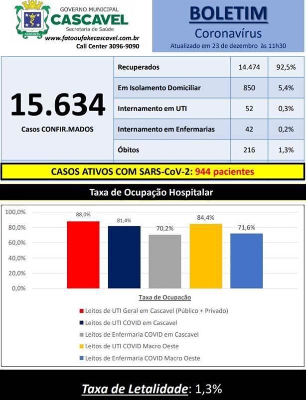 Nesta quarta-feira (23), a Secretaria de Saúde confirmou 15.634 casos de Covid-19 em Cascavel. Dos casos positivos, 14.474 pessoas estão recuperadas. Até o momento, 216 óbitos foram confirmados por conta do novo coronavírus no município.