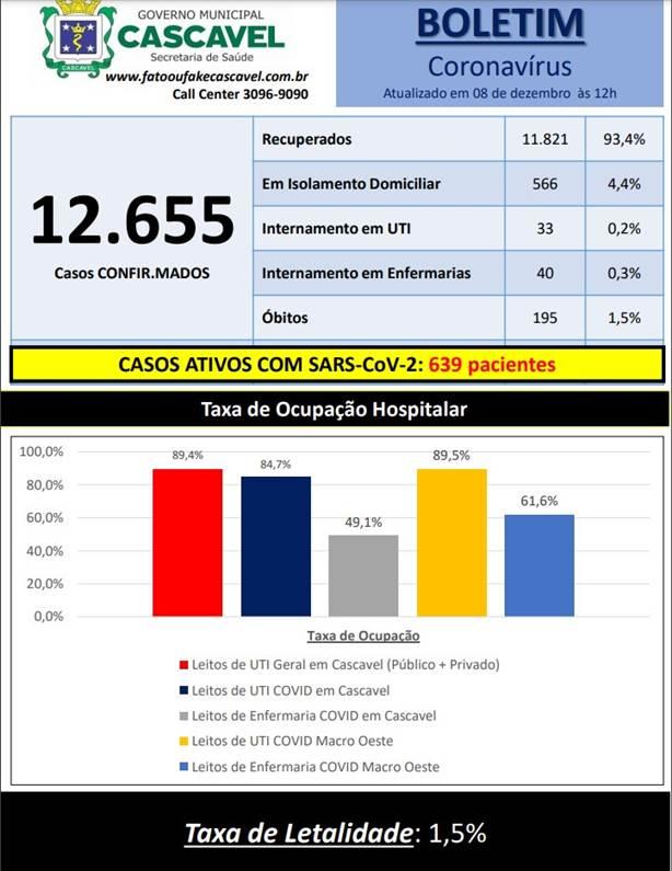 Nesta terça-feira (08), a Secretaria de Saúde confirmou 226 novos casos de Covid-19 em Cascavel. A cidade totaliza 12.655 testes positivos da doença. Além disso, 11.821 pessoas estão recuperadas. Até o momento, 195 óbitos foram confirmados por conta do novo coronavírus no município.