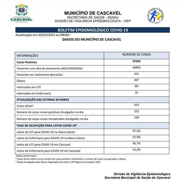 Neste sábado (20), a Secretaria de Saúde de Cascavel, divulgou o boletim atualizando os casos de Coronavírus em Cascavel. No momento são 27.943 casos positivos. Desses, 26.893 estão recuperados. Na cidade 431 pessoas estão em isolamento domiciliar.