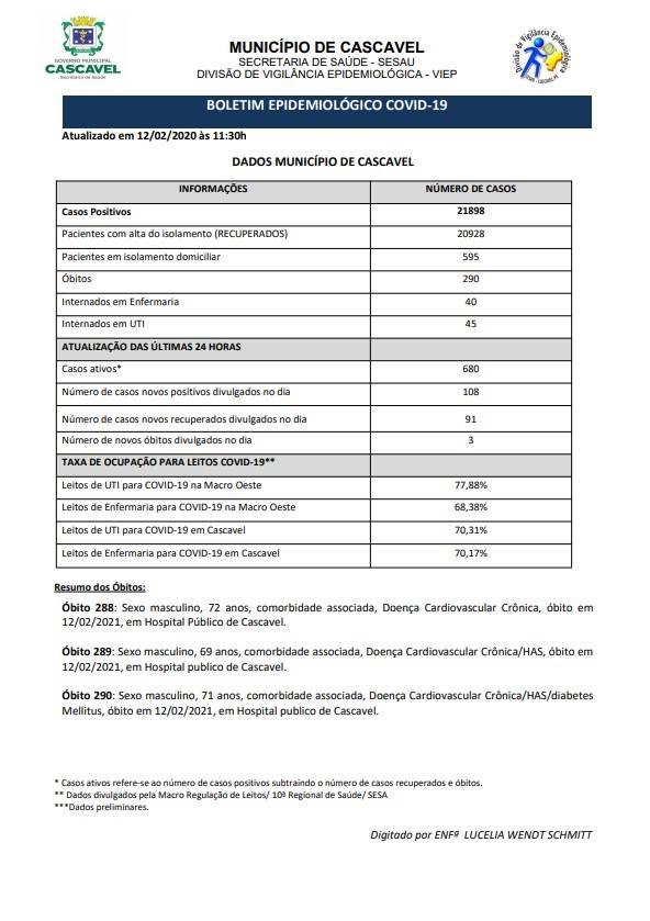 Nesta sexta-feira (12), a Secretaria de Saúde confirmou 21.898 casos de Covid-19 em Cascavel. Dos casos positivos, 20.928 pessoas estão recuperados.