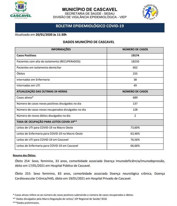 Nesta terça-feira (19), a Secretaria de Saúde confirmou 19.174 casos de Covid-19 em Cascavel. Dos casos positivos, 18.230 pessoas estão recuperadas.