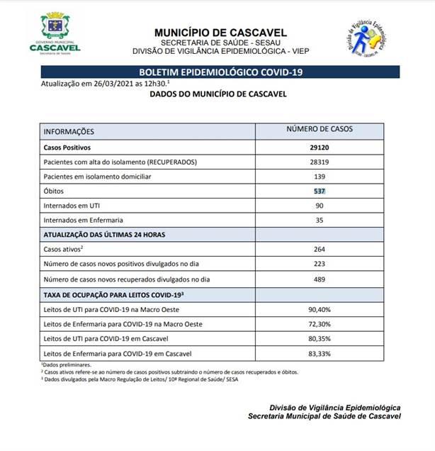 No total 537 pessoas já morreram com Covid-19 em Cascavel.