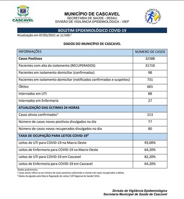 Conforme os dados, existiam 88 pessoas internadas em leitos de UTI e 27 em leitos de enfermaria. Ao todo, 665 pessoa morreram.