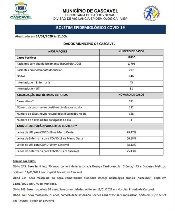 Dos casos confirmados, 297 pacientes permanecem em isolamento domiciliar, 51 estão internados em UTI e 43 em enfermaria. A cidade segue com 246 mortes. Quatro novas mortes foram registradas nas últimas 24h: