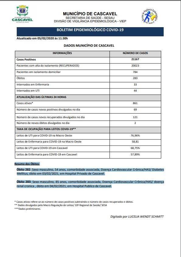 Resumo dos Óbitos: Óbito 282: Sexo masculino, 54 anos, comorbidade associada, Doença Cardiovascular Crônica/HAS/ Diabetes Mellitus, óbito em 03/02/2021, em Hospital Privado de Cascavel. Óbito 283: Sexo masculino, 85 anos, comorbidade associada, Doença Cardiovascular Crônica/HAS/ doença renal cronica , óbito em 04/02/2021, em Hospital Publico de Cascavel.