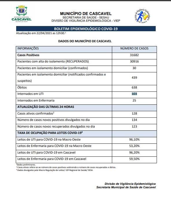 Na atualização de quinta-feira (22), a Secretaria de Saúde de Cascavel divulgou o boletim atualizando os casos de Coronavírus no município. No momento são 31.682 casos positivos, 30.916 pessoas se recuperaram da doença na cidade. Outras 439 pessoas estão em isolamento domiciliar.