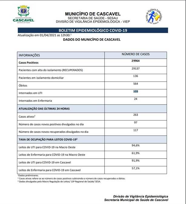 Nesta quinta-feira (01), a Secretaria de Saúde de Cascavel, divulgou o boletim atualizando os casos de Coronavírus em Cascavel. No momento são 29.867 casos positivos. No momento 29.137 pessoas se recuperaram da doença na cidade. Outras 136 pessoas estão em isolamento domiciliar.