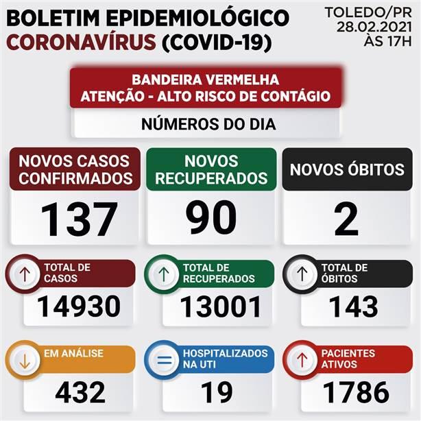 Neste domingo, dia 28/02/2021, tivemos a confirmação de 137 novos casos da COVID-19, em Toledo