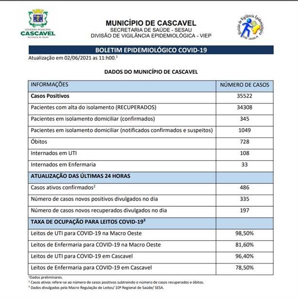 A Prefeitura de Cascavel divulgou na quarta-feira (02), o boletim de casos de coronavírus na cidade. Cascavel tem ao todo 35.522 casos positivos, sendo que 34.308 pessoas já se recuperaram da doença. Atualmente 1.049 pessoas encontram-se em isolamento domiciliar com casos confirmados e suspeitos.