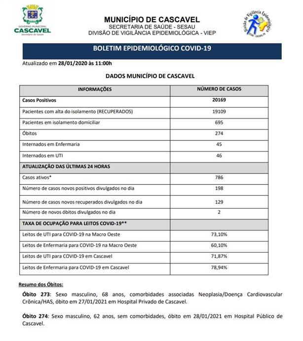 - Óbito 274: Sexo masculino, 62 anos, sem comorbidades, óbito em 28/01/2021 em Hospital Público de Cascavel