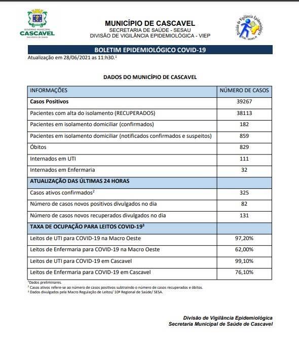 A Prefeitura de Cascavel divulgou nesta segunda-feira (28), o boletim de casos de coronavírus na cidade. Cascavel tem ao todo 39.267casos positivos, sendo que 38.113 pessoas já se recuperaram da doença. Atualmente 859 pessoas encontram-se em isolamento domiciliar com casos confirmados e suspeitos.