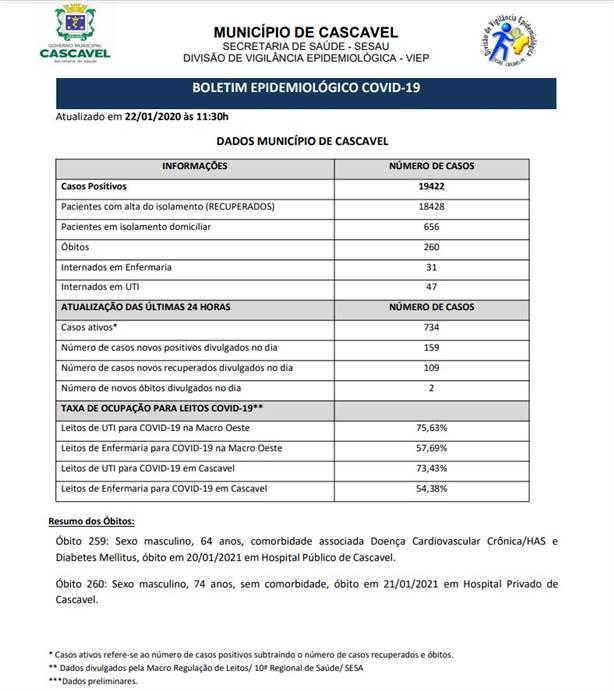 Nesta sexta-feira (22), a Secretaria de Saúde confirmou 19.422 casos de Covid-19 em Cascavel. Dos casos positivos, 18.428 pessoas estão recuperadas.