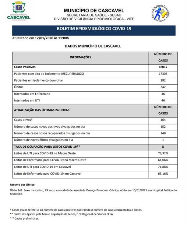 Dos casos confirmados, 382 pacientes permanecem em isolamento domiciliar, 46 estão internados em UTI e 36 em enfermaria. A cidade segue com 242 mortes. A cidade registrou uma nova morte nas últimas 24h: Sexo masculino, 79 anos, comorbidade associada Doença Pulmonar Crônica, óbito em 10/01/2021 em Hospital Público do Município.