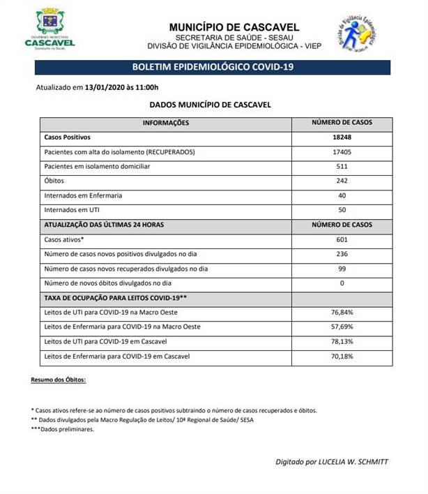 Nesta quarta-feira (13), a Secretaria de Saúde confirmou 18.248 casos de Covid-19 em Cascavel. Dos casos positivos, 17.405 pessoas estão recuperadas.