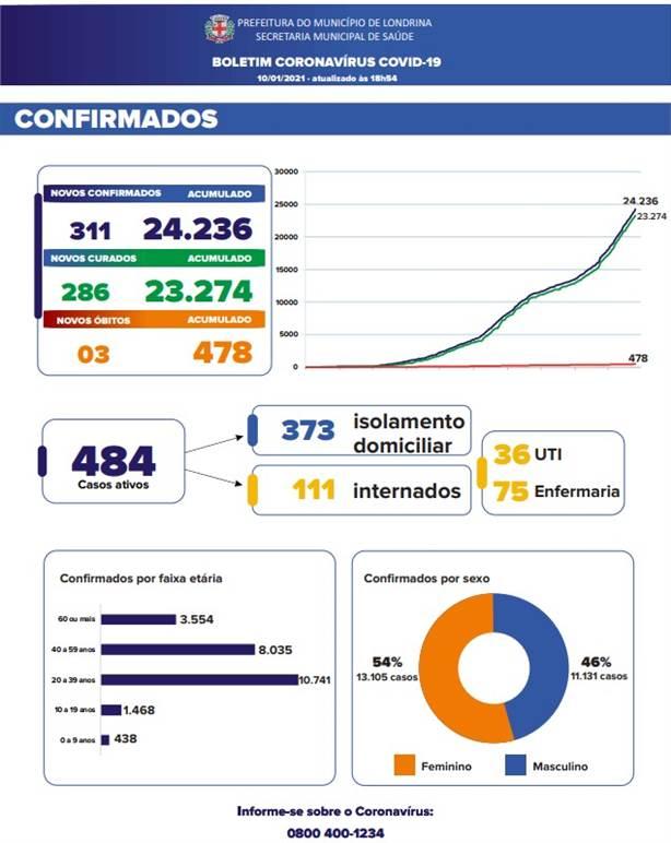 O último boletim epidemiológico de Londrina, deste domingo (10), aponta que em Londrina, houve mais três mortes por Covid-19 em 24h. No acumulado agora são 478 óbitos pela doença desde o início da pandemia.