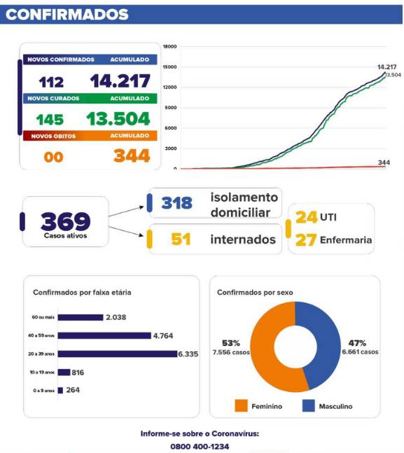 Por outro lado, 145 pacientes se recuperaram da doença e o número dos considerados curados é de 13.504. São 369 casos ativos, sendo 318 em isolamento domiciliar e 51 internados - 27 na enfermaria e 24 na Unidade de Terapia Intensiva (UTI).