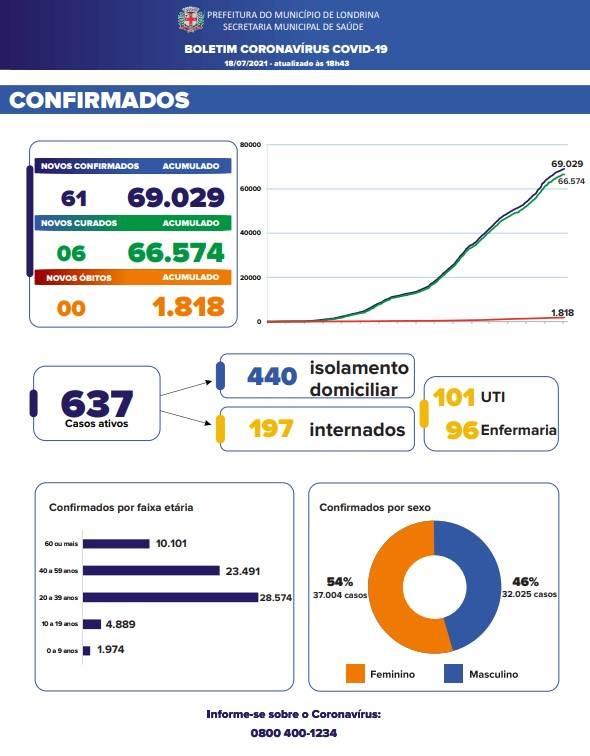 Foram registrados 61 novos casos nas últimas 24 horas. Assim, o município chegou a 69.029 confirmações. Londrina registra ainda 637 casos ativos, sendo 440 em isolamento domiciliar com acompanhamento das equipes médicas e 197 internados - 96 na enfermaria e 101 na Unidade de Terapia Intensiva (UTI).