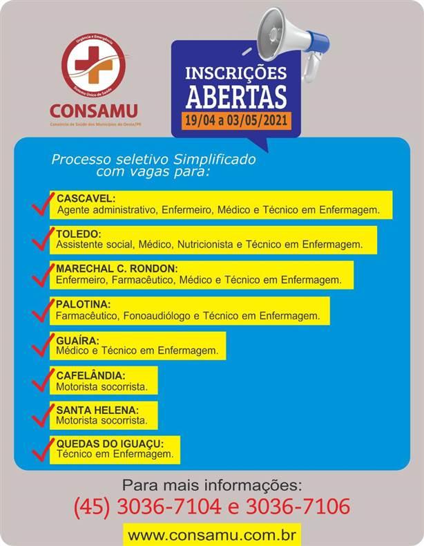 As inscrições para o Processo Seletivo Simplificado, do Consórcio de Saúde dos Municípios, do oeste do Paraná, (Consamu) terminam hoje (03).