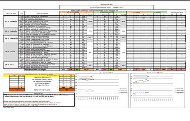 A superlotação de leitos de UTI exclusivo para tratamento da Covid-19 é problema que vem atingindo o Paraná. Na macrorregião Oeste, 95% dos leitos de unidade de terapia intensiva estão ocupados nesta quinta-feira (03).