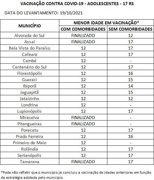 Das 21 cidades que fazem parte da 17ª regional de Saúde,16 já começaram a vacinação contra Covid-19 de adolescentes que não tem comorbidades. Em Alvorada do Sul e Jataizinho, por exemplo, a vacinação está aberta para quem tem 12 anos ou mais e faz parte do púbico geral.