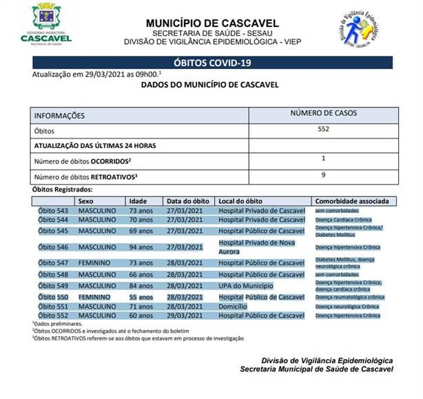 A Prefeitura de Cascavel divulgou nesta segunda-feira (29), a relação de óbitos registrados durante o fim de semana, causados por Covid-19. Foram 10 mortes de sexta-feira (26), até a noite de domingo (28).