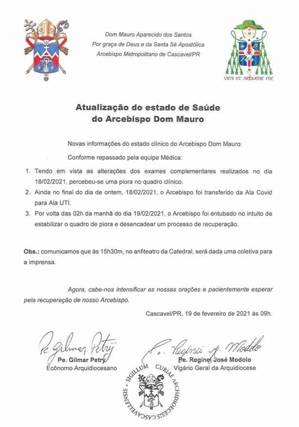 O Arcebispo Dom Mauro apresentou pioras no quadro clínico, após exames realizadas na quinta-feira (18), em Cascavel. Ele estava internado na Ala Covid e agora segue na Unidade de Terapia Intensiva.