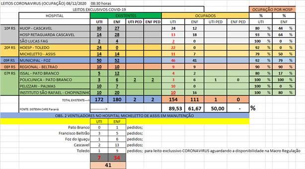 A assessoria de Comunicação do Consamu divulgou nesta terça-feira (08), divulgou a ocupação de leitos que atendem exclusivamente casos de coronavírus. Em Cascavel, dos 46 leitos de UTI destinados à doença, 39 estão ocupados.
