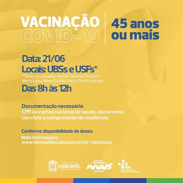 Cascavel começa a vacinar contra a Covid-19, nesta segunda-feira (21), pessoas com 45 anos ou mais do público em geral. E assim por diante, por faixa etária, em ordem decrescente de idade.