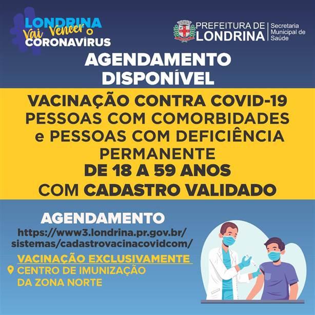 Qualquer pessoa que tenha alguma comorbidade e mais de 18 anos em Londrina pode agendar a vacinação contra a covid. A marcação é feita na página da Prefeitura. A vacinação vai ser liberada desde que o cadastro prévio tenha sido aprovado.