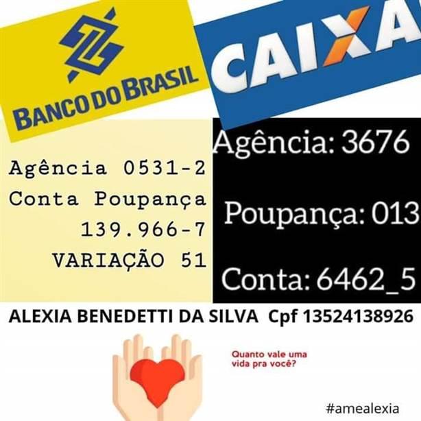 Quem tiver interesse em ajudar pode depositar qualquer valor nas contas, ou acesse a vaquinha online: AME Alexia