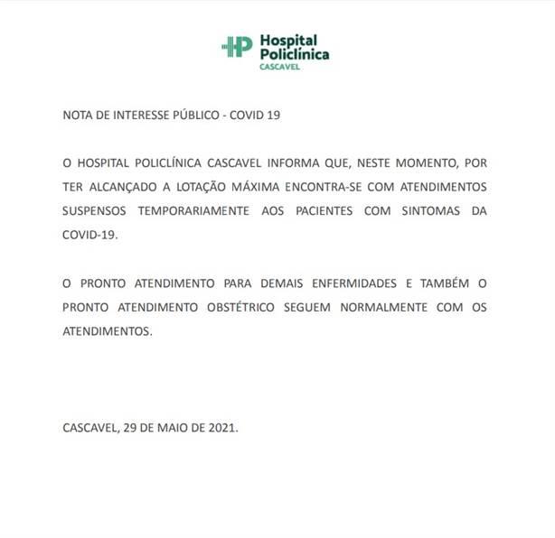 O Hospital Policlínica emitiu uma nota na manhã deste sábado (29), informando que a unidade alcançou a lotação de máxima e os atendimento foram suspenso aos paciente com Covid-19 temporariamente.