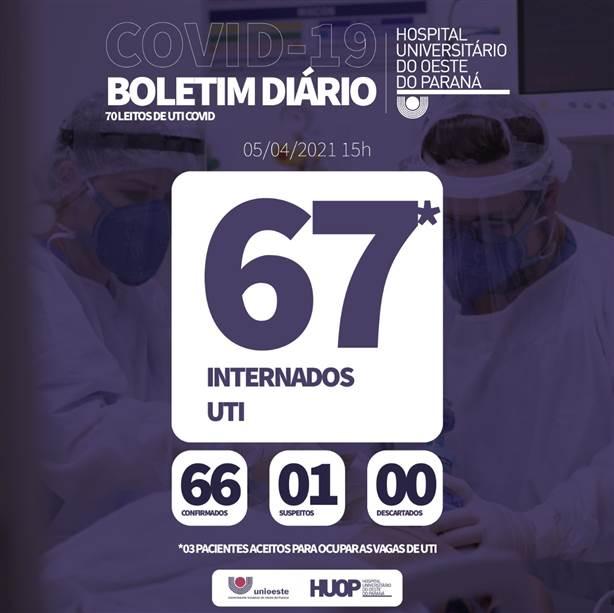 - Paciente sexo masculino, 65 anos, morador de Quedas do Iguaçu, estava internado desde o dia 28/03.