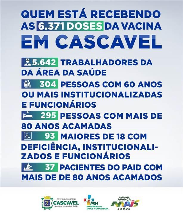 A imunização será feita em duas aplicações e o envio da remessa para a segunda dose às pessoas que estão sendo imunizadas será feito pelo governo federal, mas ainda não há uma data definida para a chegada. O Município de Cascavel chegou a assinar um documento com intenção de compra da vacina Coronavac, mas essa aquisição foi inviabilizada, já que o Ministério da Saúde assinou contrato de exclusividade com o Instituto Butantan para a distribuição da vacina em todo o Brasil.