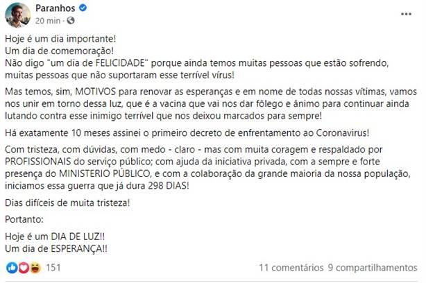 "Hoje é um dia de luz. Dia de esperança", escreveu Paranhos, ao se referir ao recebimento do materiais que devem ser destinados a vacinação. Na manhã deste domingo (17), a 10ª Regional de Saúde recebeu 95.550 itens de insumos para iniciar a vacinação contra Coronavírus na região.