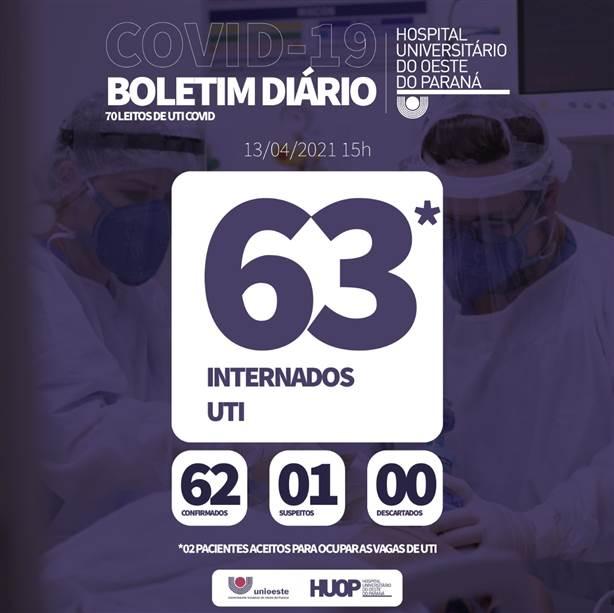 A unidade conta com 70 leitos de UTI exclusivos para tratamento da Covid-19 e atualmente, 63 estão ocupados. Desses, pacientes testaram positivo para a doença e um aguarda resultado de exame.