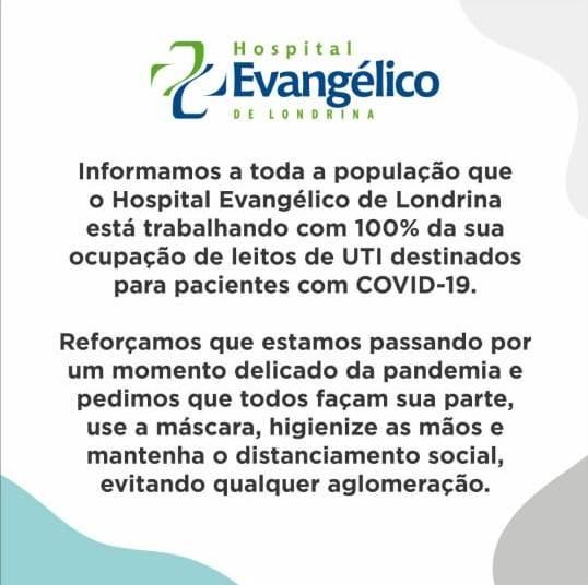 O Hospital Evangélico emitiu um comunicado pelas redes sociais alertando sobre a lotação dos leitos de UTI, Unidade de Terapia Intensiva, de Covid-19. Segundo a direção do hospital, desde essa terça-feira (22), os leitos destinados, exclusivamente, a tratamento de pacientes infectados com o novo coronavírus estão com 100% de ocupação. São 10 leitos.