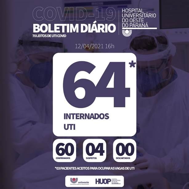 O Hospital Universitário divulgou na tarde desta segunda-feira (12), a taxa de ocupação de leitos. Na unidade, 64 pessoas estão internadas na ala UTI exclusiva para tratamento da Covid-19.
