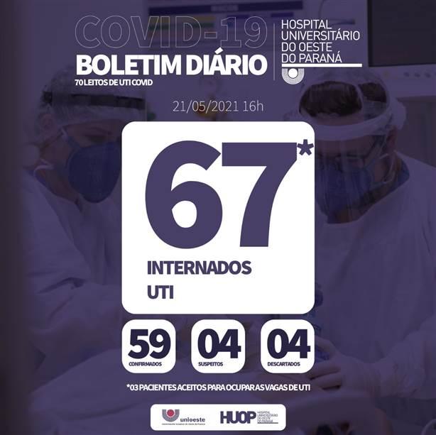 O Hospital Universitário tem 70 leitos exclusivos para tratamento da Covid-19, e tem 67 pacientes internados nesta sexta-feira (21). A unidade admitiu três novos pacientes que devem ser internados nas próximas horas, chegando a 100% da taxa de ocupação.
