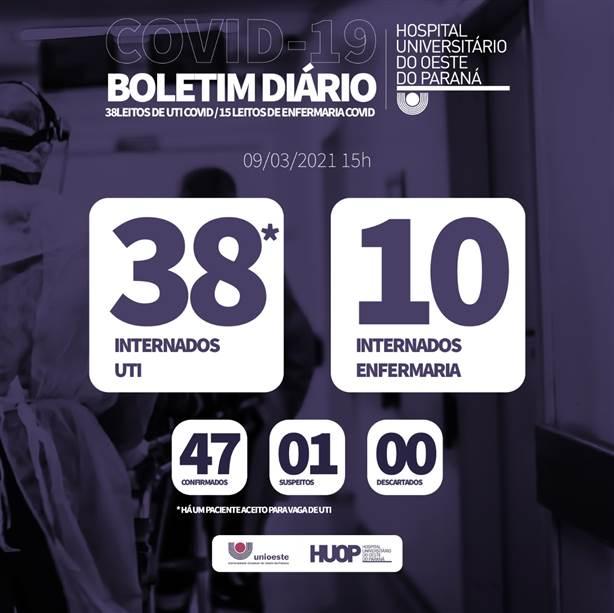 "É com pesar que o Hospital Universitário do Oeste do Paraná (Huop) comunica a morte de um paciente com exame positivo para Sars-CoV-2. A paciente, de 79 anos, moradora de Catanduvas, estava internada na unidade desde o dia 20/01 e evoluiu a óbito nessa segunda-feira (08)".