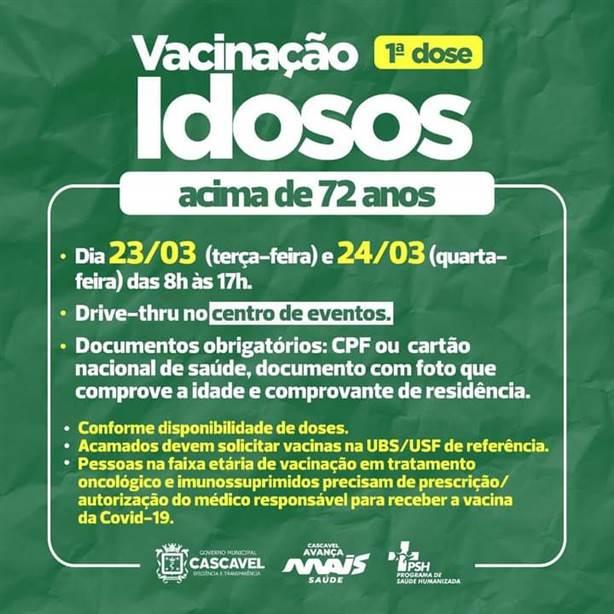 Começa nesta terça-feira (23), a vacinação para idosos acima de 72 anos em Cascavel.