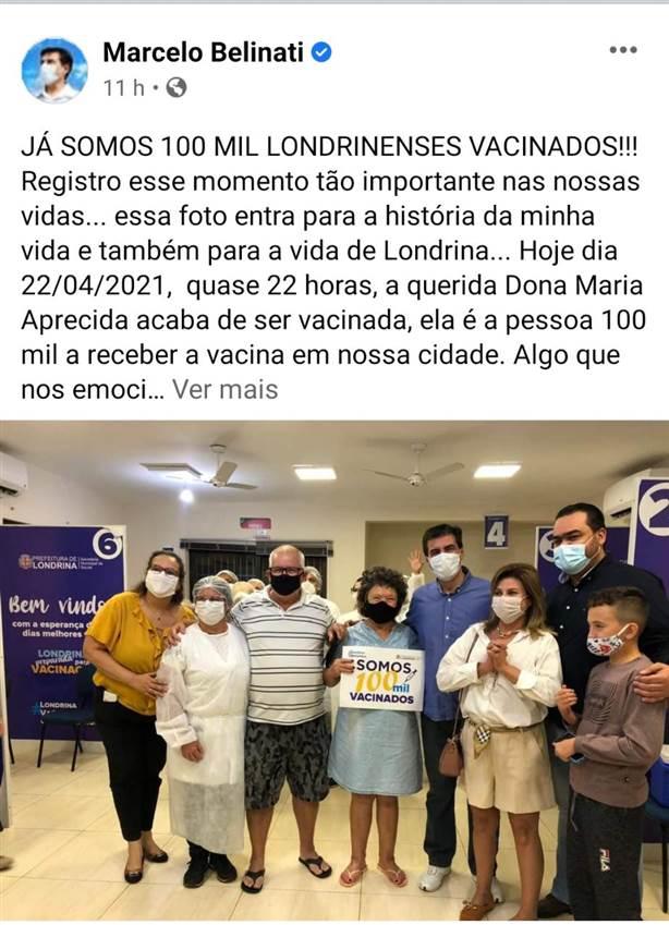 O prefeito Marcelo Belinati comemorou nas redes sociais e publicou uma foto com várias pessoas abraçadas. "Já somos 100 mil londrinenses vacinados. Registro esse momento tão importante nas nossas vidas... essa foto entra para a história da minha vida e também para a vida de Londrina", comentou.