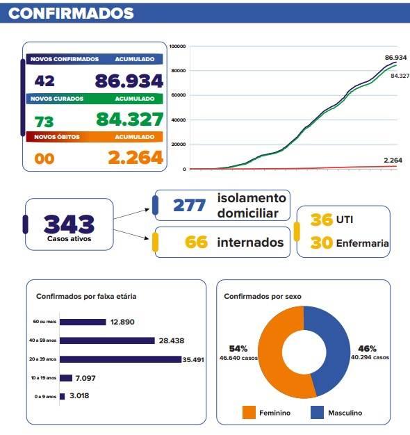 O município já atingiu 2.264 óbitos desde o início da pandemia. Foram registrados 42 novos casos nas últimas 24 horas e o município chegou a 86.934 confirmações.