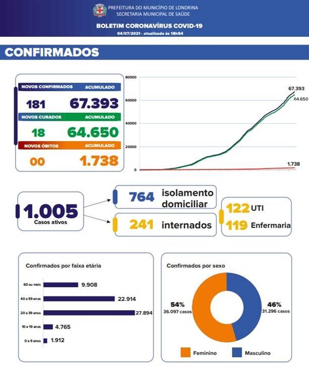 Foram registrados 181 novos casos nas últimas 24 horas, o município chegou a 67.393 confirmações. Londrina registra ainda 1.005 casos ativos, sendo 764 em isolamento domiciliar com acompanhamento das equipes médicas e 241 internados - 119 na enfermaria e 122 na Unidade de Terapia Intensiva (UTI).