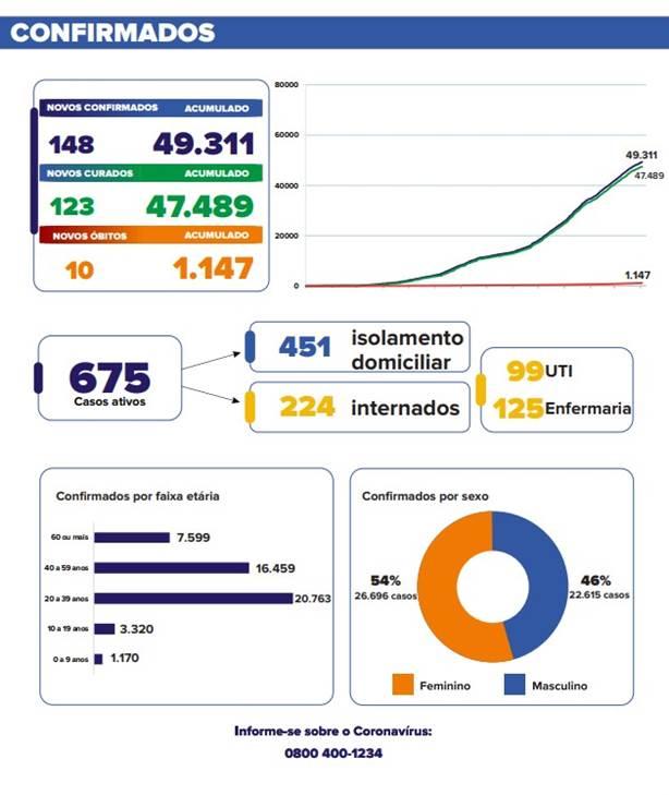 Os números também continuam subindo com 148 novos casos nas últimas 24 horas, o município chegou a 49.311 confirmações. São 675 casos ativos, sendo 451 em isolamento domiciliar com acompanhamento das equipes médicas e 224 internados - 125 na enfermaria e 99 na Unidade de Terapia Intensiva (UTI).