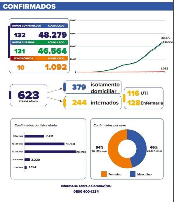 Os números também continuam subindo com 132 novos casos nas últimas 24 horas, o município chegou a 48.279 confirmações. São 623 casos ativos, sendo 379 em isolamento domiciliar com acompanhamento das equipes médicas e 244 internados - 128 na enfermaria e 116 na Unidade de Terapia Intensiva (UTI).