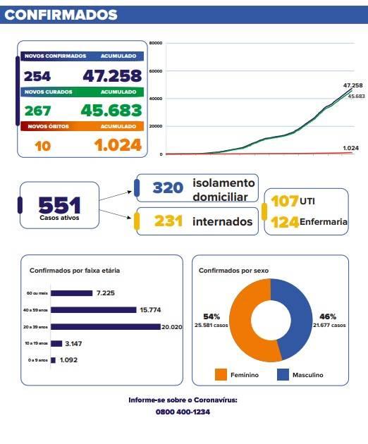 Os números também continuam subindo com 254 novos casos nas últimas 24 horas, o município chegou a 47.258 confirmações. São 551 casos ativos, sendo 320 em isolamento domiciliar com acompanhamento das equipes médicas e 231 internados - 124 na enfermaria e 107 na Unidade de Terapia Intensiva (UTI).