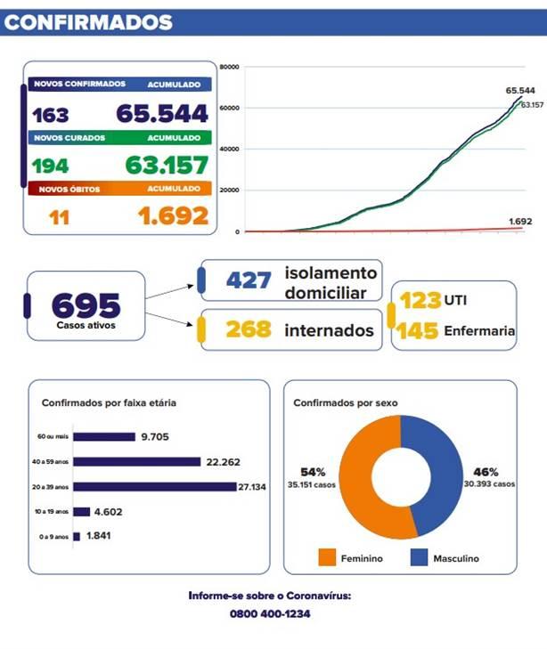 Foram registrados 163 novos casos nas últimas 24 horas, o município chegou a 65.544 confirmações. Londrina registra ainda 695 casos ativos, sendo 427 em isolamento domiciliar com acompanhamento das equipes médicas e 268 internados - 145 na enfermaria e 123 na Unidade de Terapia Intensiva (UTI).